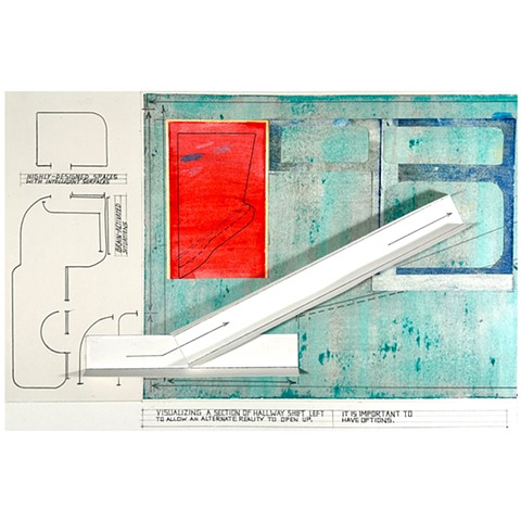 Sokolow’s architectural renderings inject a sly humor and subjectivity into a form that usually strives for the ideal. Historical anecdotes nudge us to consider how chance and temperament play a bigger role than we care to admit. Elements of color and abstraction formally encase these musings with nuance, reminding us of the futility of trying to see history 'all at once'. There are always rough edges, elision of boundaries and the capriciousness of mood.